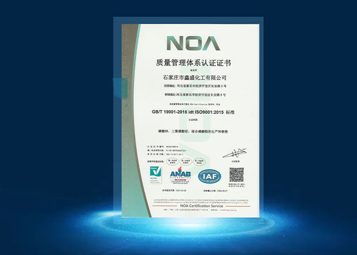 Xin Sheng has been recognized as "High and New Technology Enterprise", "Hebei Province Science and Technology-based Small and Medium Enterprises", "Specialized and Specialized New Enterprise" and other advanced enterprises. The company has strong R & D team, perfect testing equipment, rich experience in producing environmental protection anticorrosive pigments, professional phosphate production line, citing advanced reaction, drying, crushing, filling and other equipment, to achieve high-tech equipment automation, production intelligence, manufacturing standards are more stringent, the process is more refined, the performance of anticorrosive antirust pigment is more excellent. The annual production capacity is 3000 tons of zinc phosphate series, 3600 tons of aluminum tripolyphosphate series and 1500 tons of aluminum phosphate series. We have three major certification systems (ISO9001, ISO14001, ISO45001), which are in line with the European Union certification REACH registration, ROHS standard requirements, SGS testing. Our products are sold all over the country and exported abroad, exported to Southeast Asia and Europe.